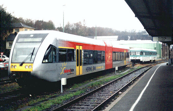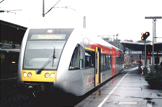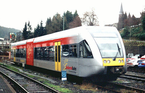 ![]() Seit dem 26.09.1999 bedient die neugegründete Hellertalbahn GmbH die Strecke Betzdorf - Haiger - Dillenburg. Dafür wurden drei Triebwagen der Bauart GTW 2/6 mit den Fahrzeugnummern 116, 117 und 118 beschafft. ![]() Dies Bild zeigt - ebenso wie das nächste - den Triebwagen 117 am 12.12.2000 im Bf. Betzdorf. ![]()